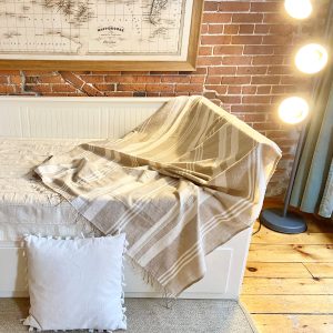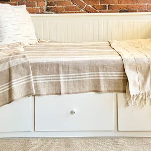 Jeté de canapé 100% coton Éthiopien. Fait en Éthiopie, avec du coton filé à la main et tissé sur un métier à tisser, selon des techniques traditionnelles ancestrales. De couleur naturelle, il a des rayures beiges. La coloration de chaque fil est faite à partir d’éléments naturels, avant d’être tissé.