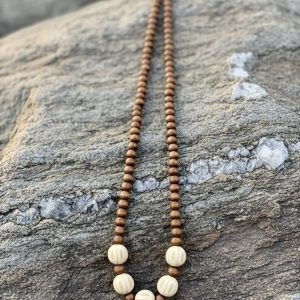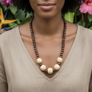 Collier en perles de bois fait à la main. Les perles sont enfilées sur un cordon. Chaque bijou de cette collection soutien une femme artisan au Cameroun offrant un revenu et de la dignité à travers son travail.
