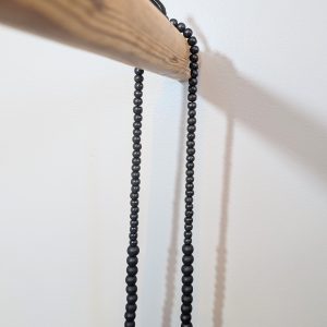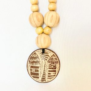 Collier en perles de bois fait à la main. Les perles sont enfilées sur un cordon. Chaque bijou de cette collection soutien une femme artisan au Cameroun offrant un revenu et de la dignité à travers son travail.
