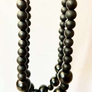 Handmade wooden bead necklace. The beads are strung on a cord. Each piece of jewelry in this collection supports a female artisan in Cameroon, providing income and dignity through her work.