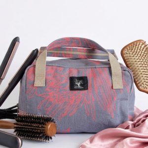 Grande Trousse de Toilette Grise et Rose – Toile Peinte à la Main | Collection Peppertree