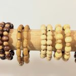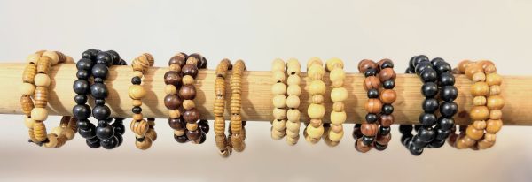 Bracelet en perles de bois fait à la main. les perles sont enfilées sur un élastique, ainsi il peut s’ajuster à chaque poignet. Chaque bijou de cette collection soutien une femme artisan au Cameroun offrant un revenu et de la dignité à travers son travail.