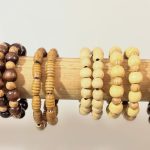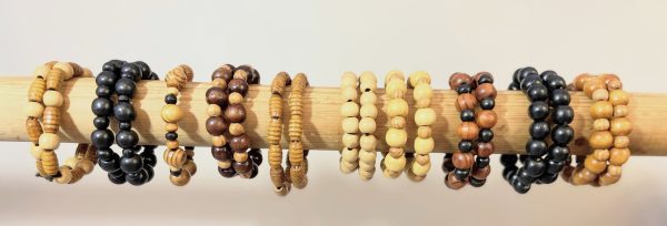 Bracelet en perles de bois fait à la main. les perles sont enfilées sur un élastique, ainsi il peut s’ajuster à chaque poignet. Chaque bijou de cette collection soutien une femme artisan au Cameroun offrant un revenu et de la dignité à travers son travail.