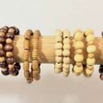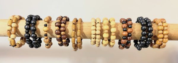 Bracelet en perles de bois fait à la main. les perles sont enfilées sur un élastique, ainsi il peut s’ajuster à chaque poignet. Chaque bijou de cette collection soutien une femme artisan au Cameroun offrant un revenu et de la dignité à travers son travail.