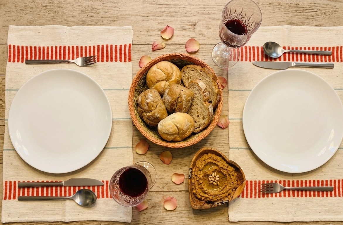 Ensemble Art de la Table – Napperons Axum, panier à pain & Bol Coeur en bois d’Olivier