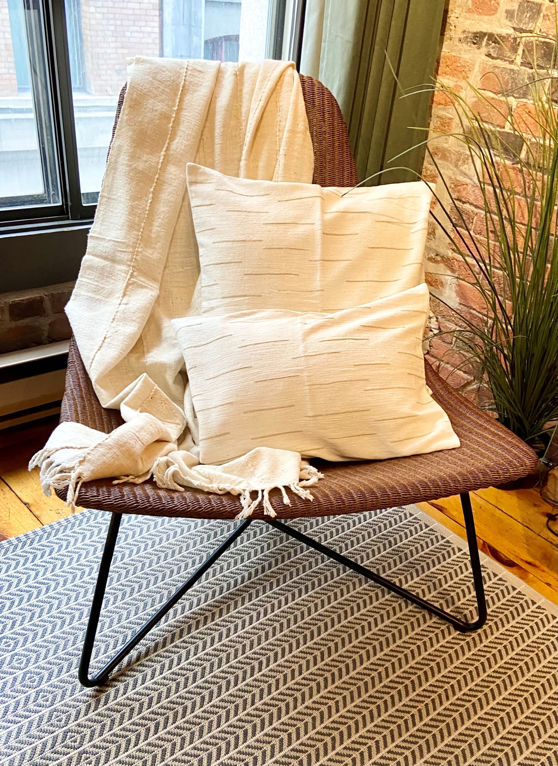 Handwoven in Ethiopia, this ivory-colored cushion, accented with charcoal or sand-colored threads, is made of 100% Ethiopian cotton. The manufacturing process of this item makes each piece unique. It may vary from one piece to the next, which ensures the authenticity of the design.