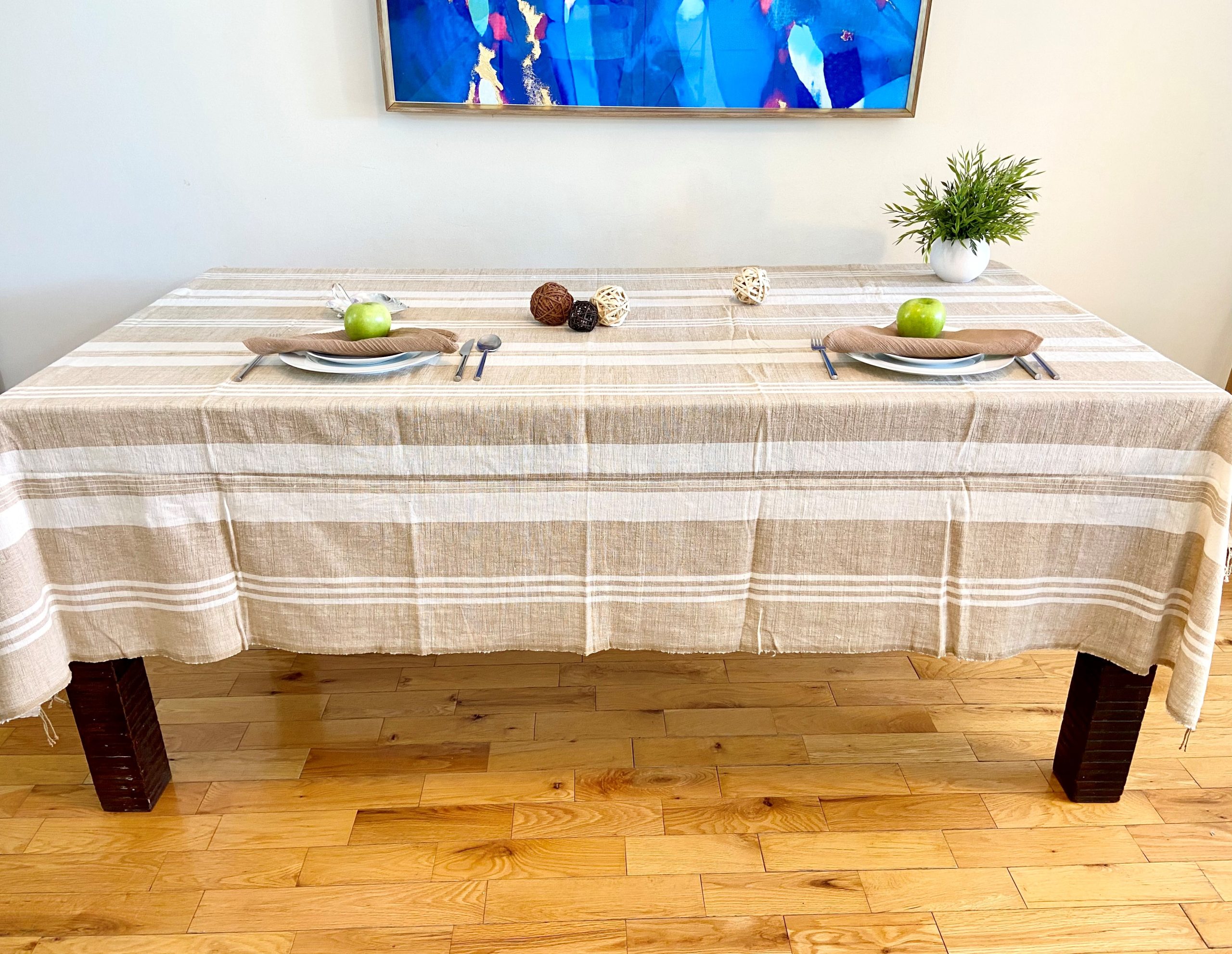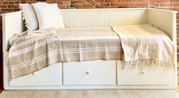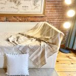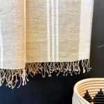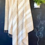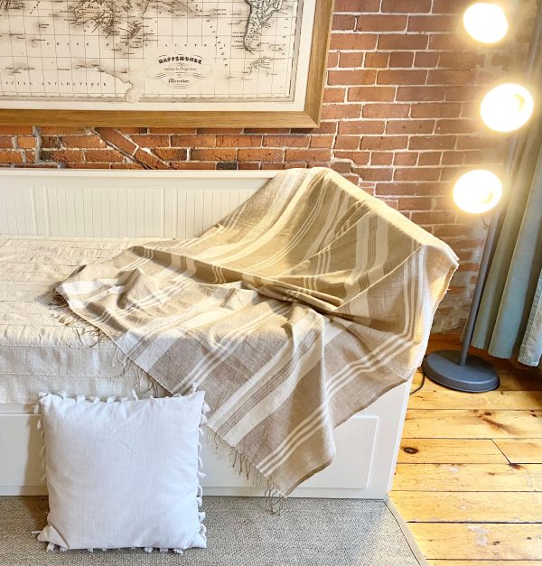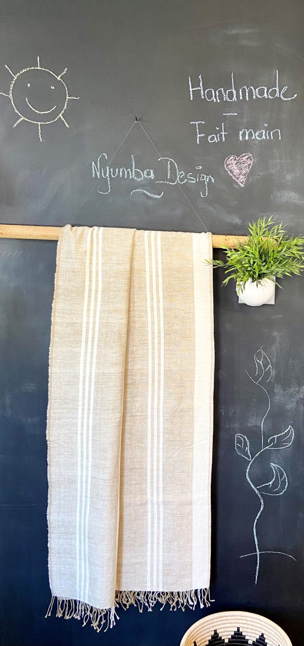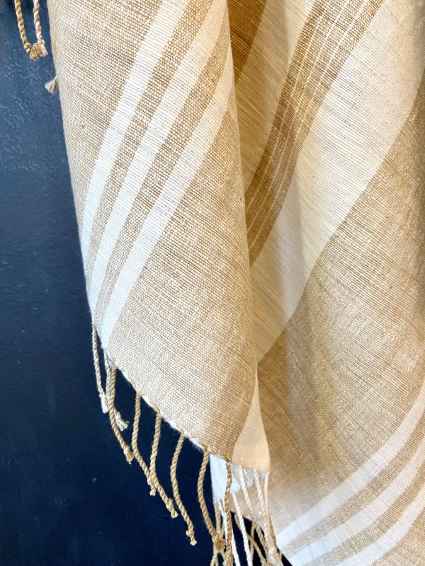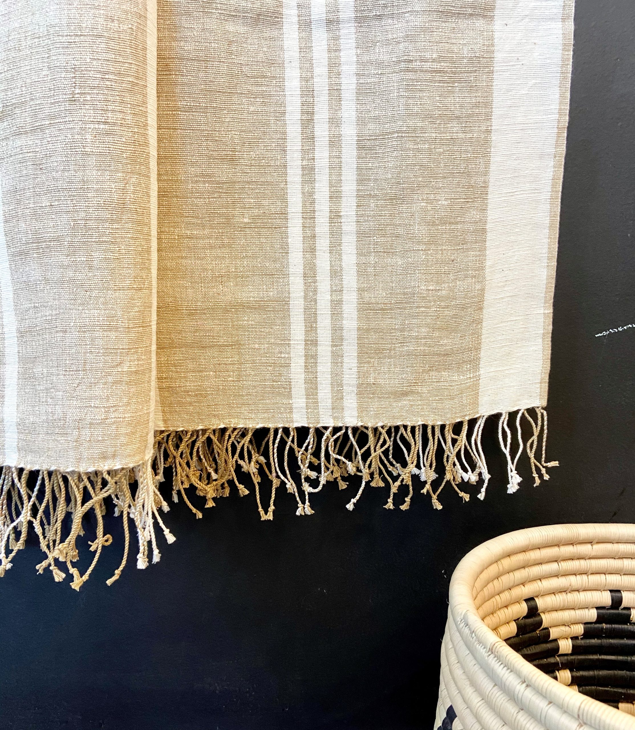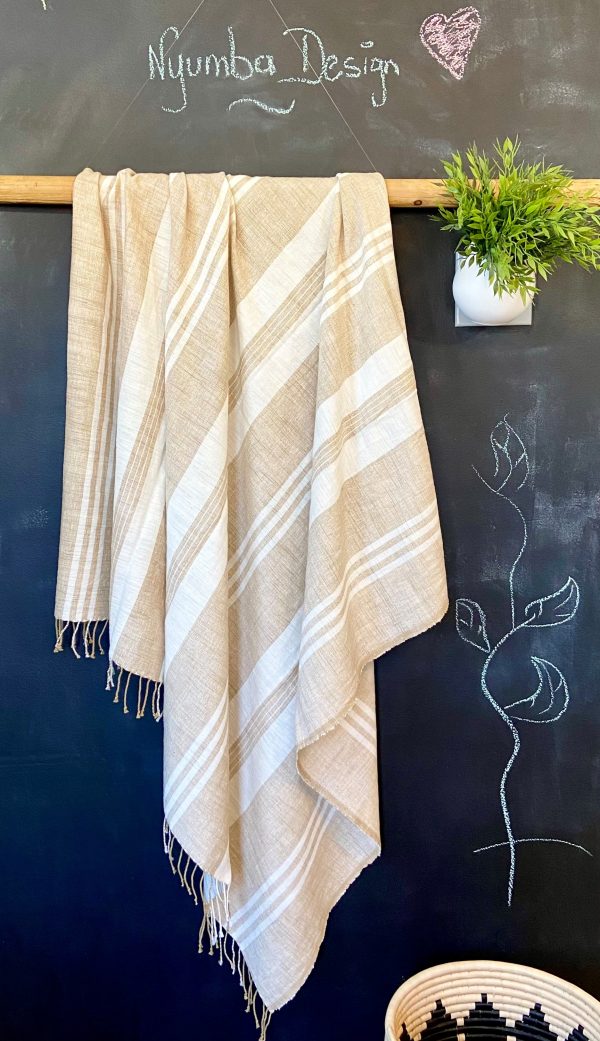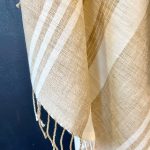 Jeté de canapé 100% coton Éthiopien. Fait en Éthiopie, avec du coton filé à la main et tissé sur un métier à tisser, selon des techniques traditionnelles ancestrales. De couleur naturelle, il a des rayures beiges. La coloration de chaque fil est faite à partir d’éléments naturels, avant d’être tissé.