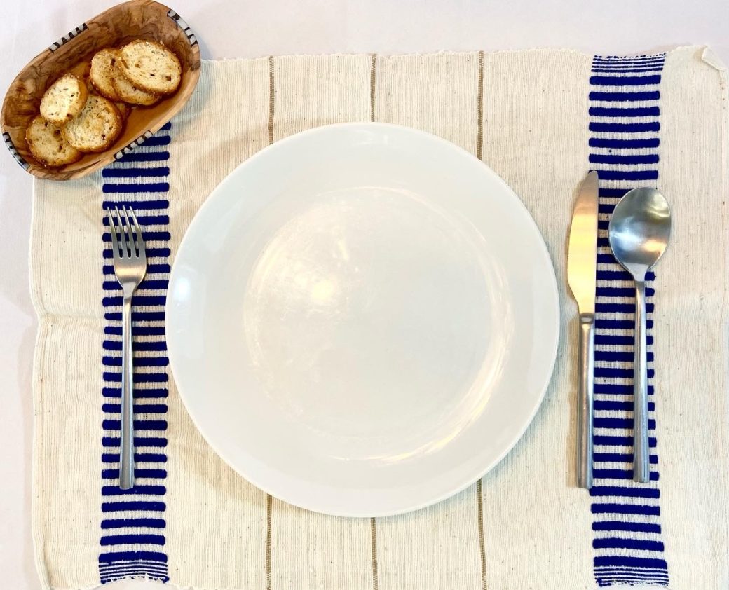 This beige and cobalt-colored placemat is handmade in Ethiopia, using hand-spun cotton then woven on a loom using time-honored traditional techniques. The manufacturing process of this item makes each piece unique. It may vary from one piece to the next. This ensures the authenticity of the design.